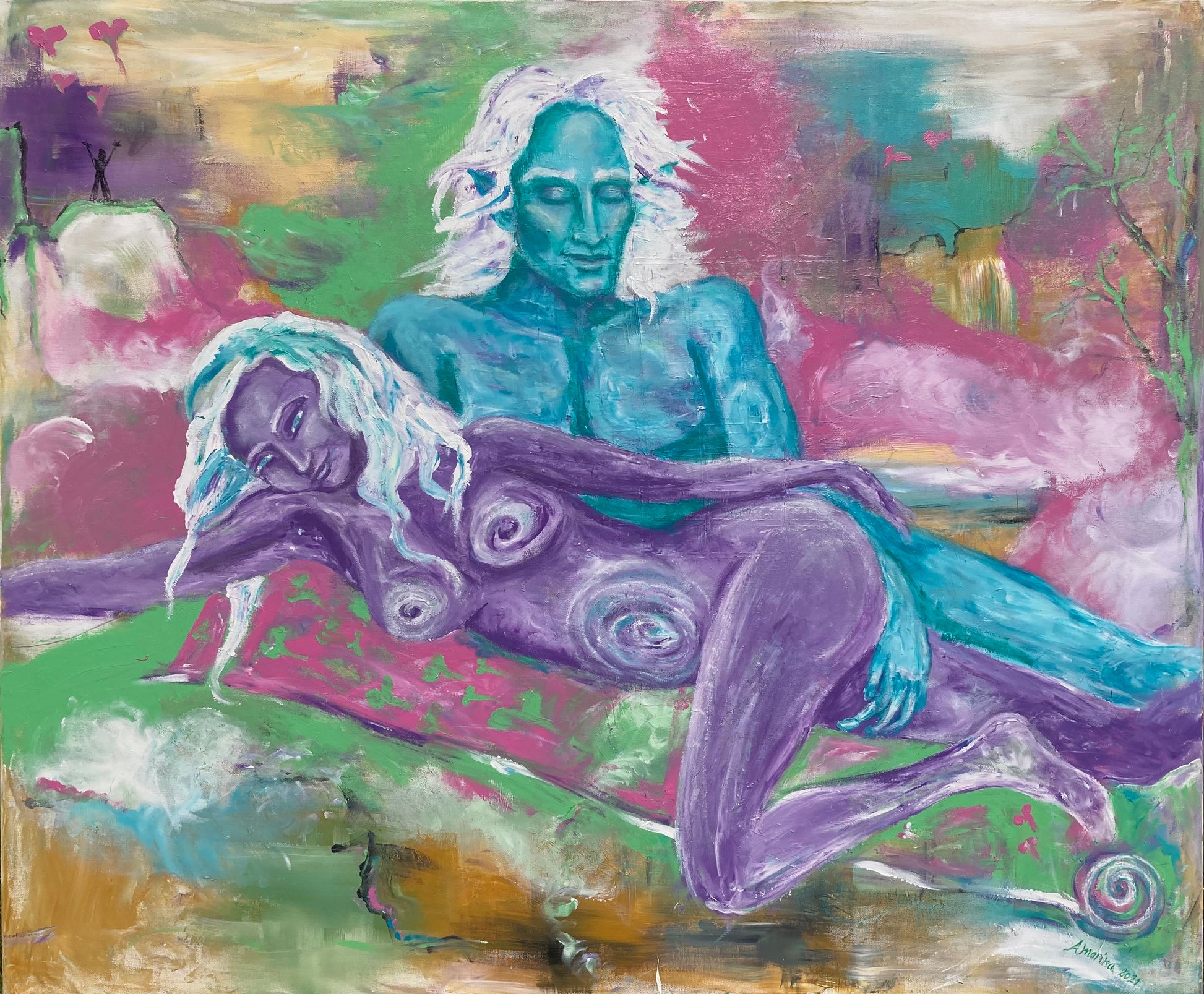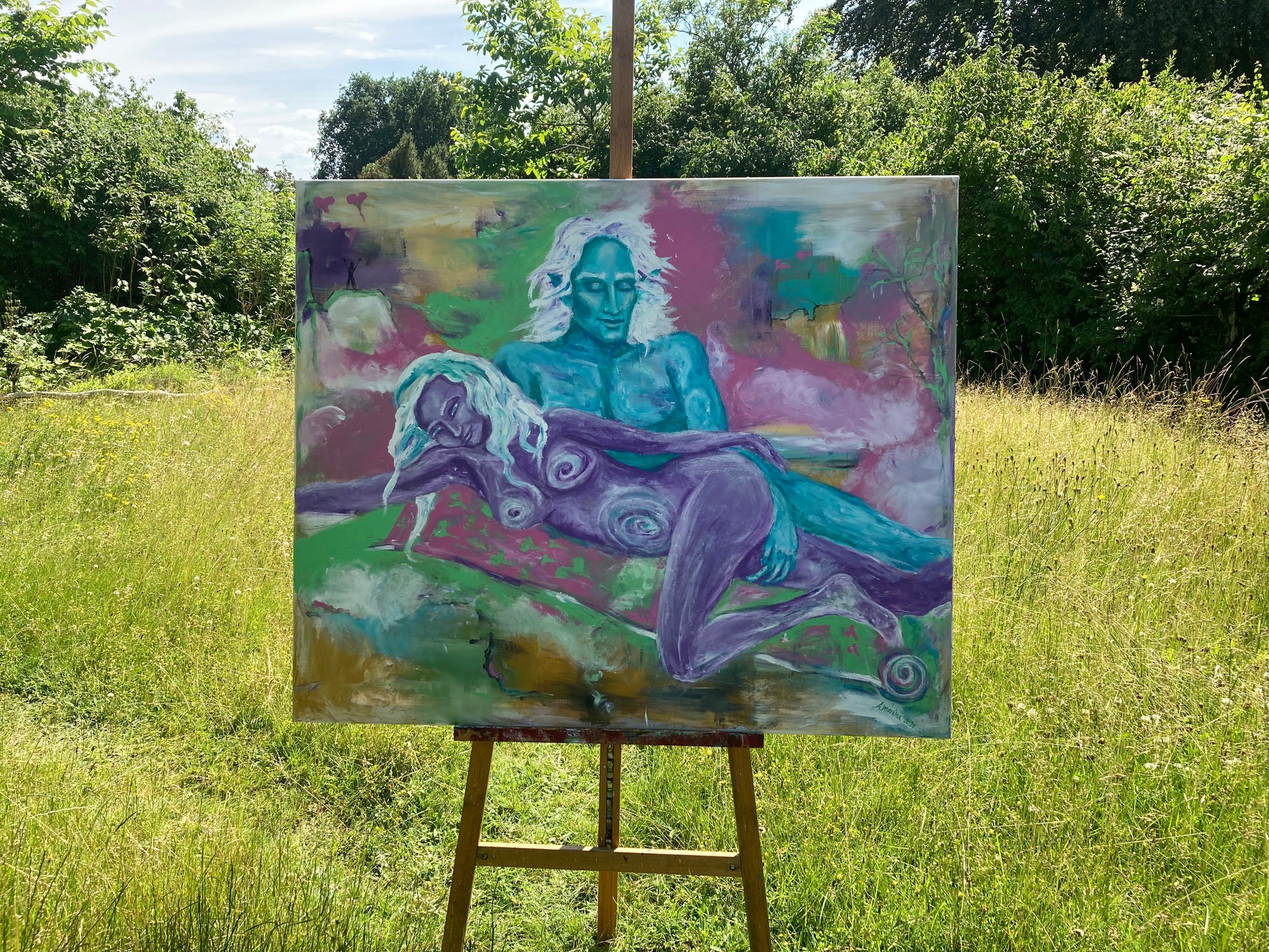 Divine nesting, Acrylic on canvas, 100x120cm, painted by bare hands and energetically encoded with love, playfulness and joy.