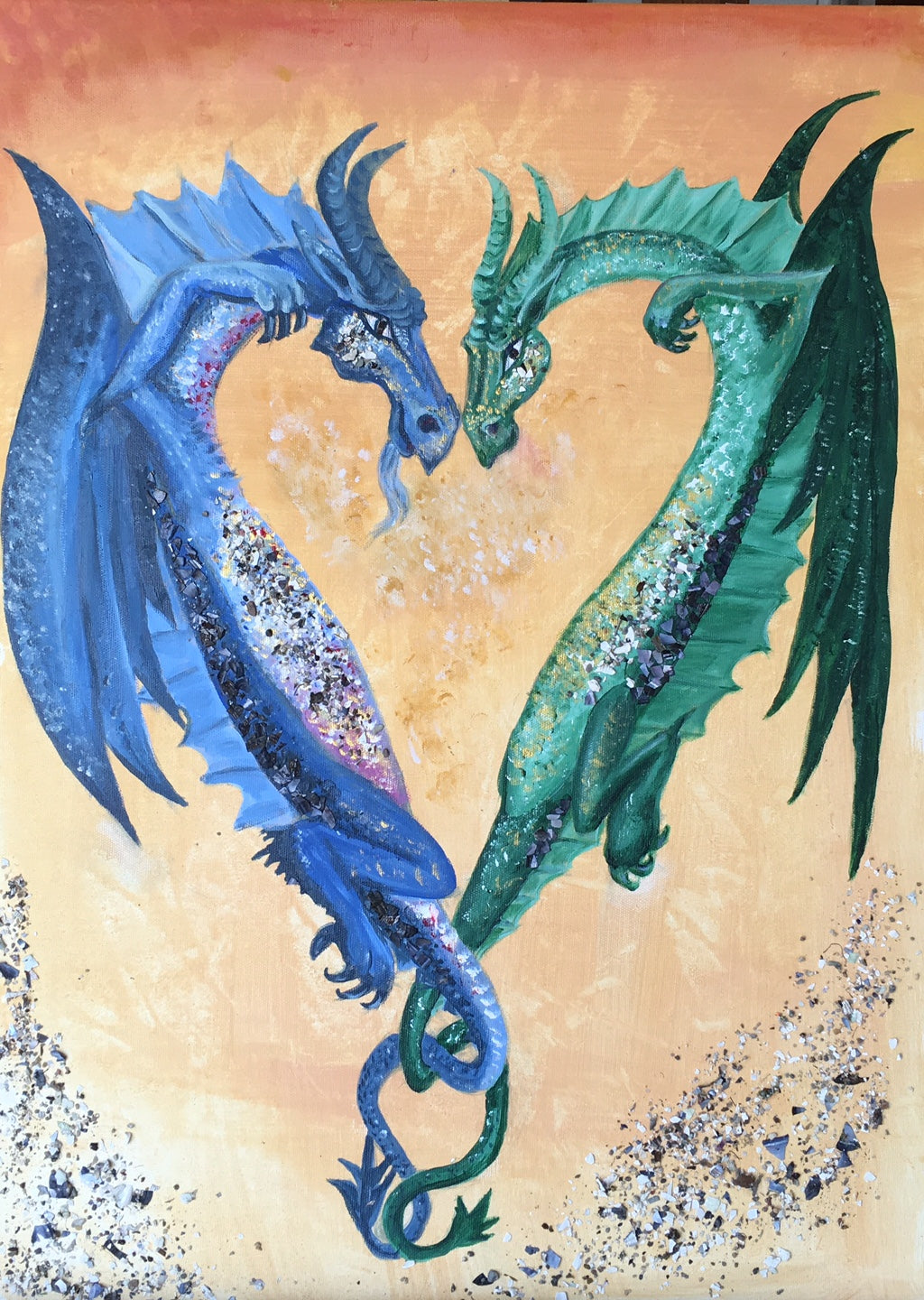 Dragons celebrating the new rise of energies that awake them from their caves underneath sacred mountains, Acrylic and sea shells on canvas,