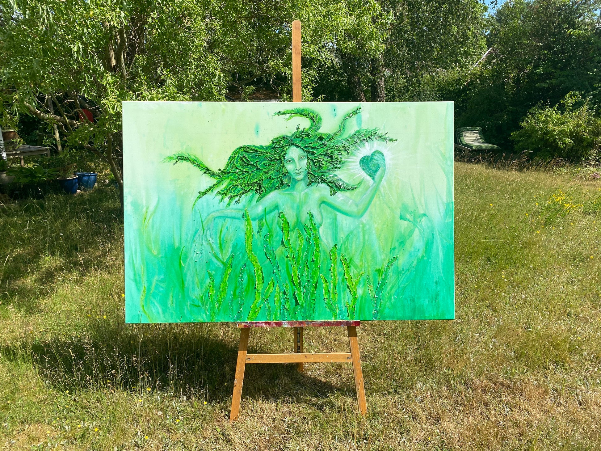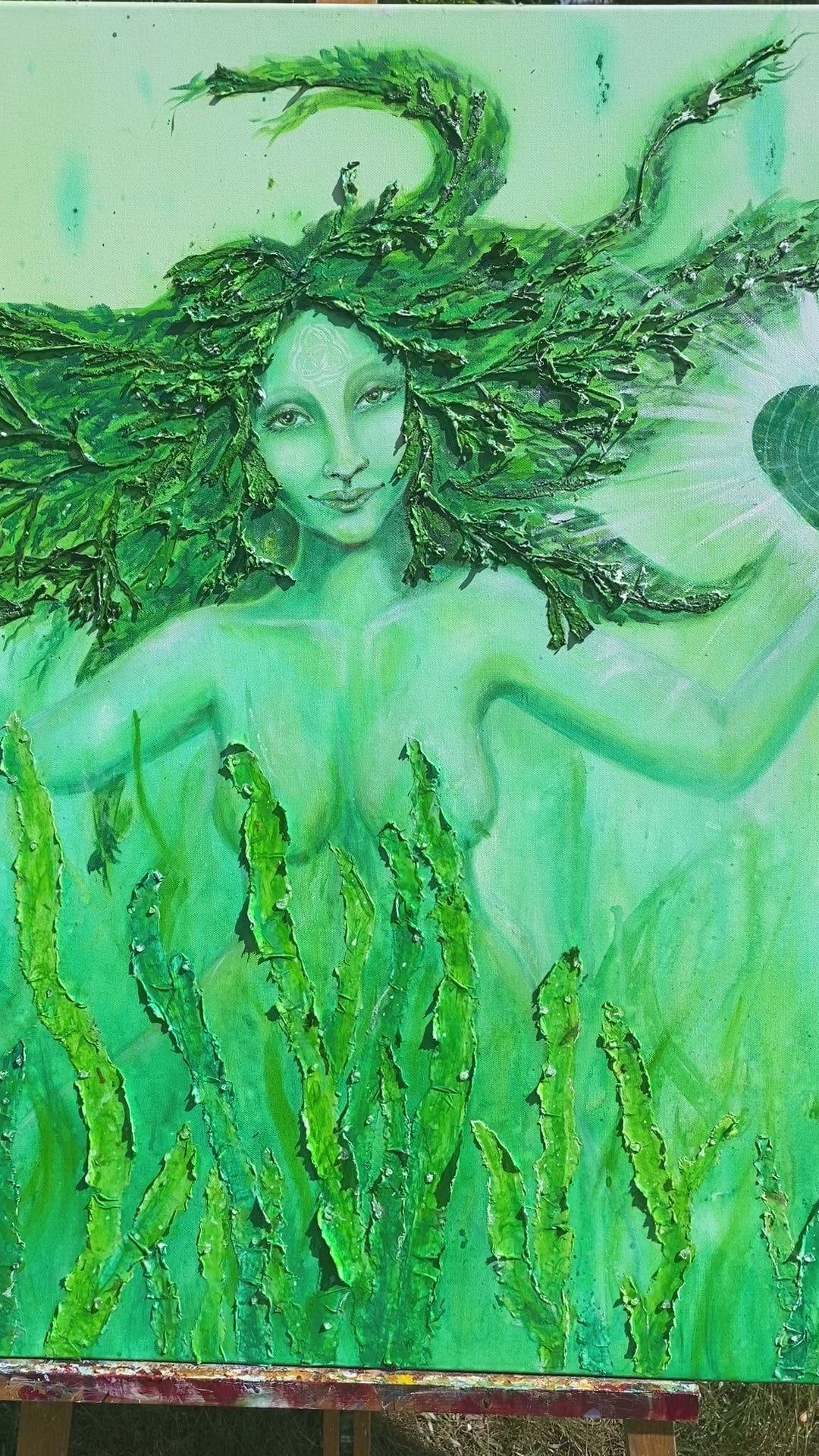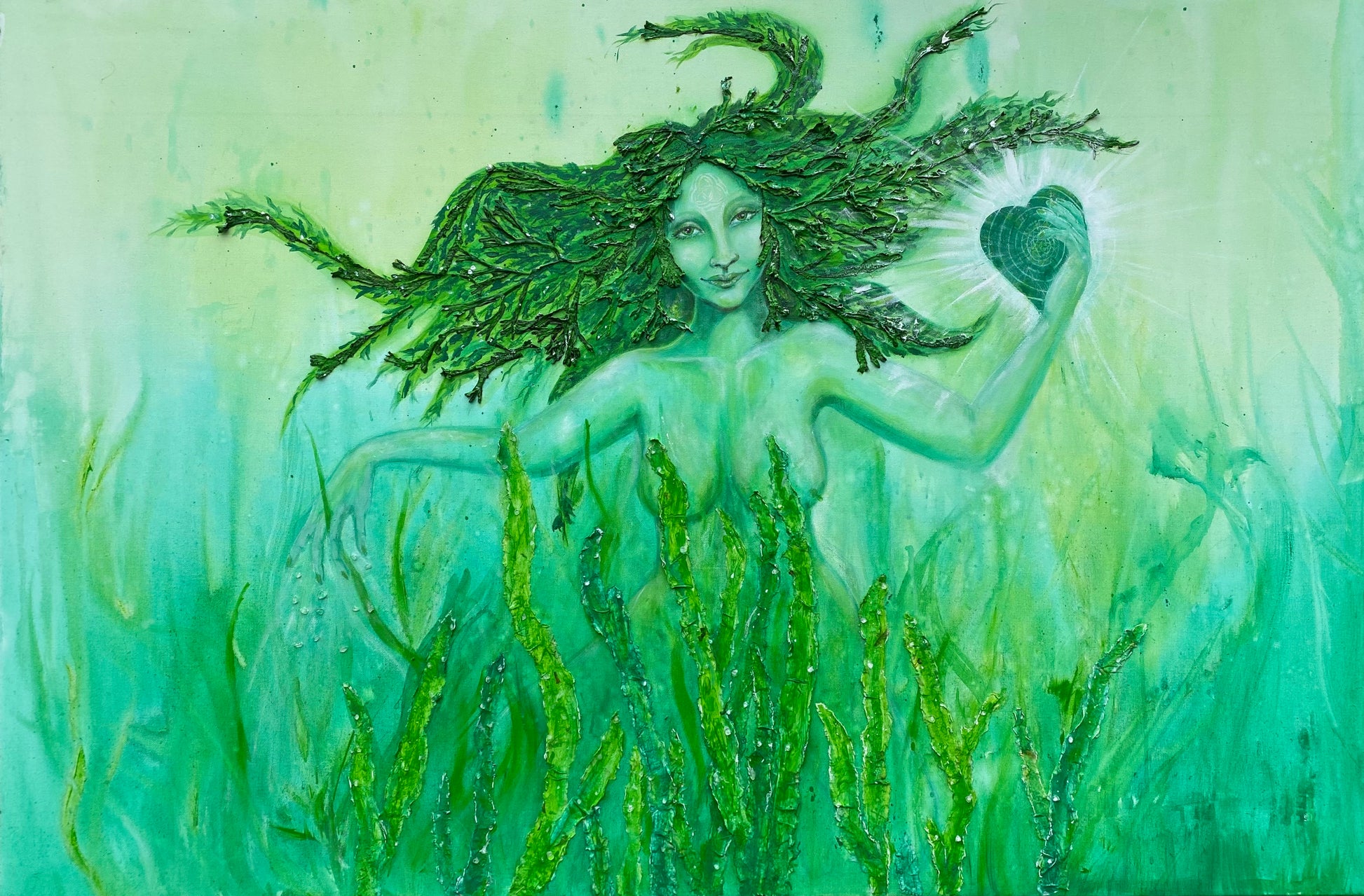 Seeding the Lovelight frequencies in Gaias waters 100x150 cm Acrylic, seaweed, handmade paper and crystals on canvas. Energetically encoded with Emerald heart light frequencies.
