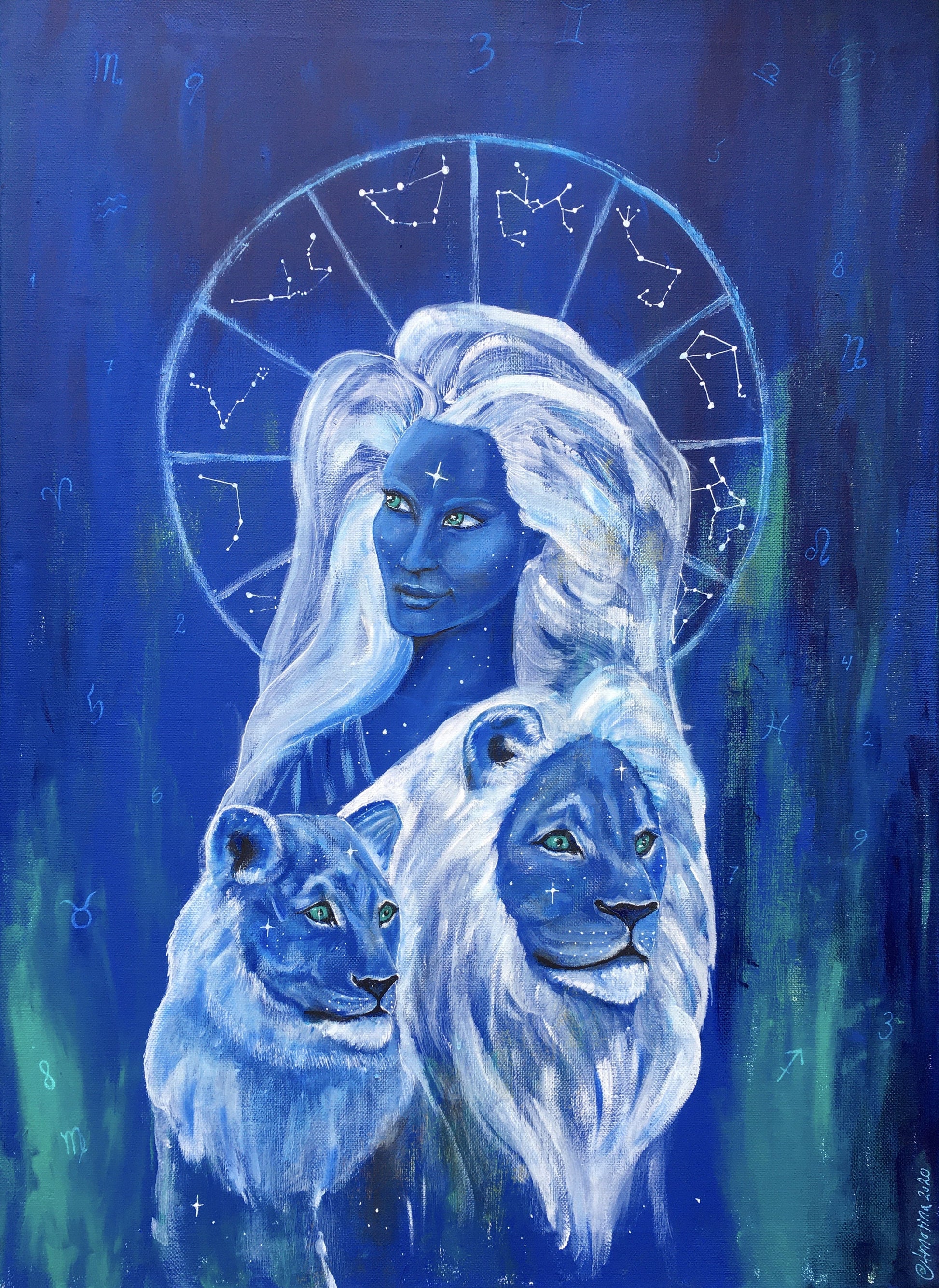 The Zodiac Shamaness is a traveller on paths between the stars. She brings a tremendous power of transformation and magic to your home and her energy is connected to the magic of stars and the numbers. This Star being has two powerful guides and guards by her side, two noble Star Lions of Lyra, and they help her to stand in her power surrounding her with pure stellar diamond energy.